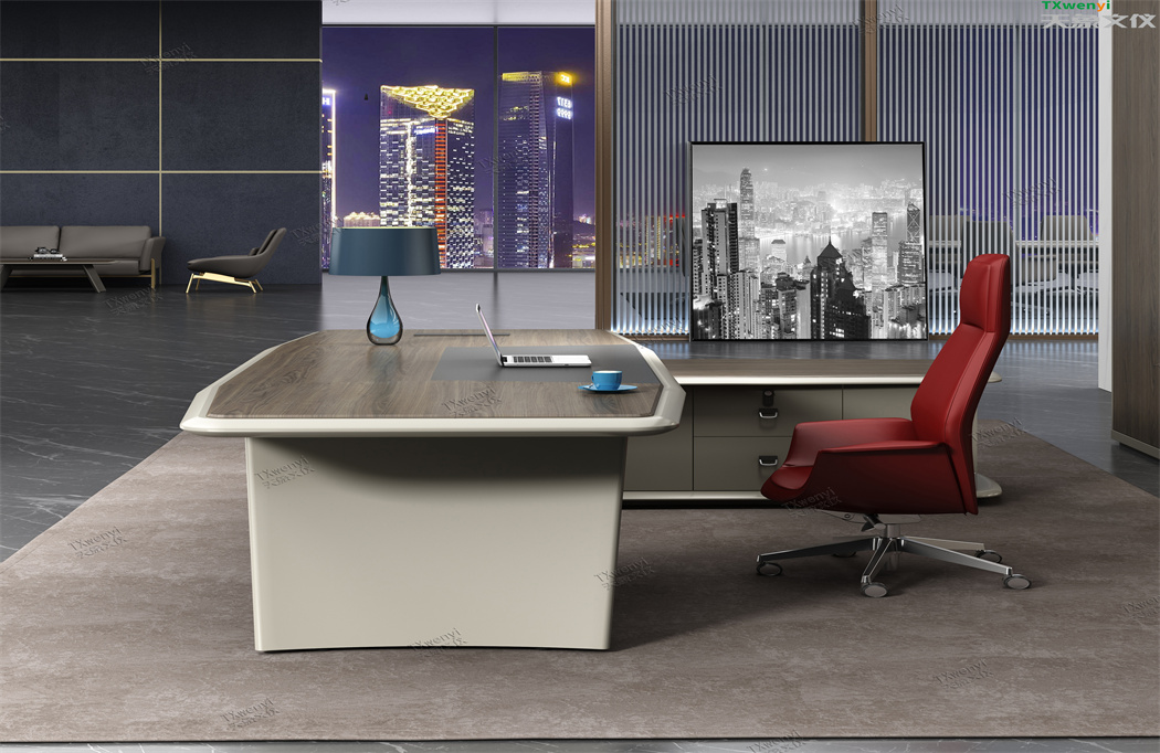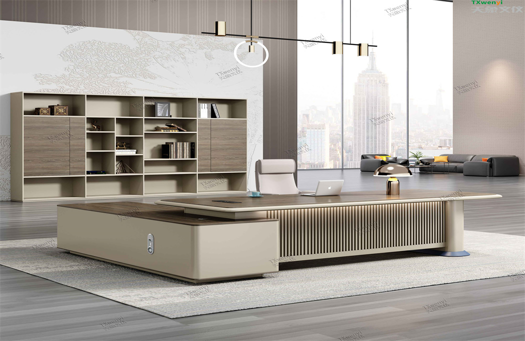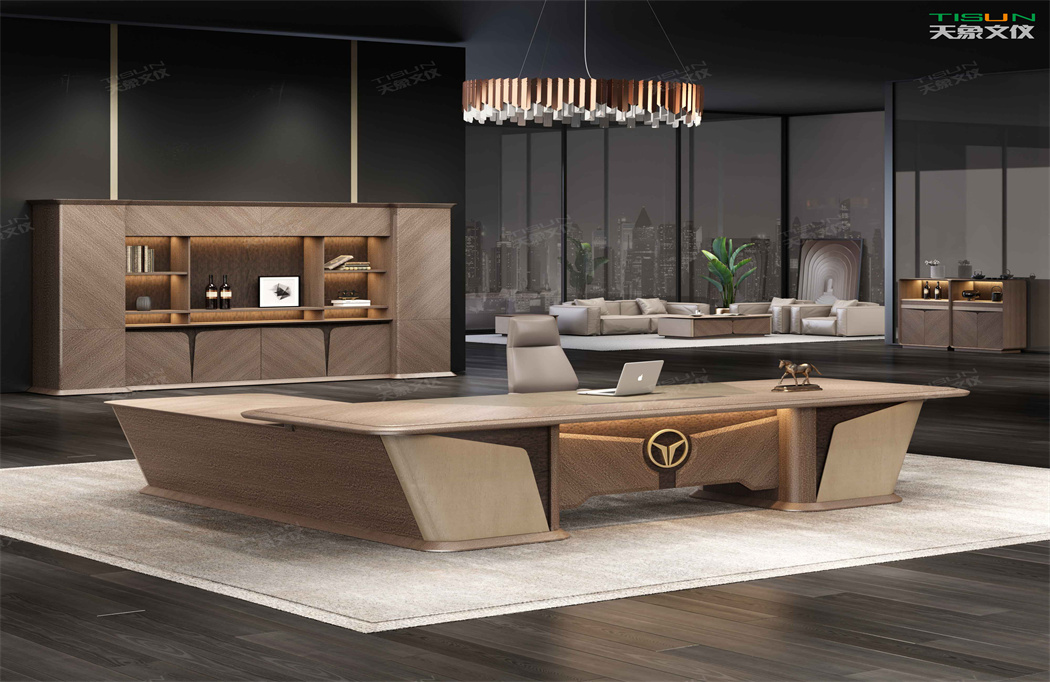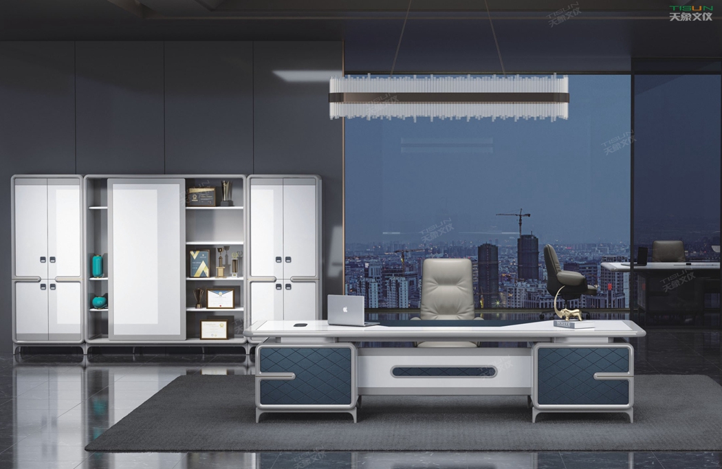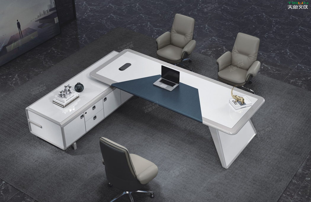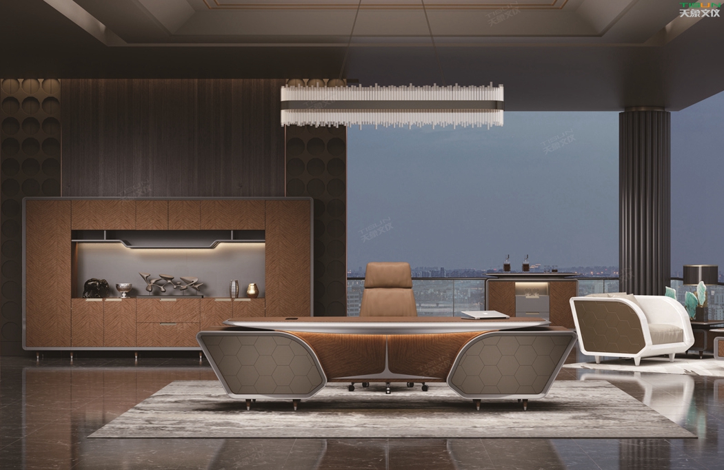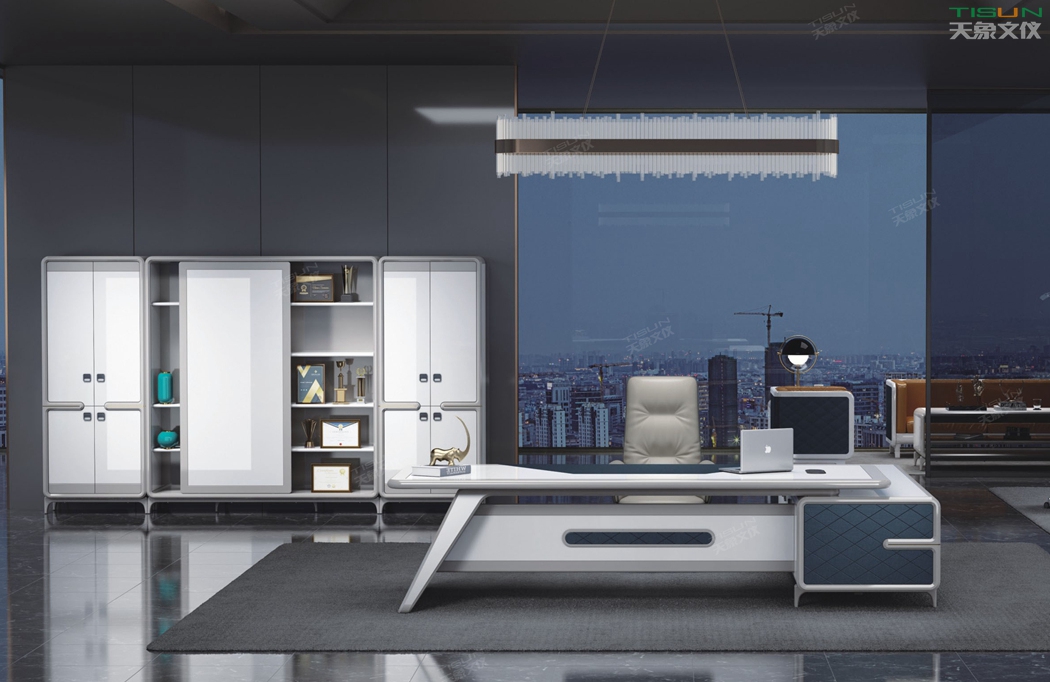 此款定制辦公家具大班臺打破傳統的做法,開闊創新,萃取傳統中式風格與現代風格之精華的相結合,打造出此款尊貴大氣的辦公桌,同時也為現代辦公環境注入了一股新的源泉。班臺大面積采用灰色超纖皮,提升辦公舒適度。細節提升品質,側邊柜增設開放存儲空間,邊柜內側CPU存放和收納功能并存,集收納與展示于一體,更能突顯主人具備現代的氣息。