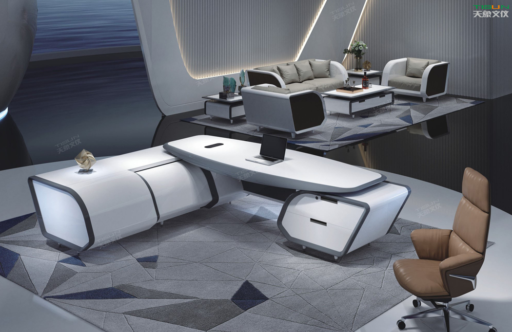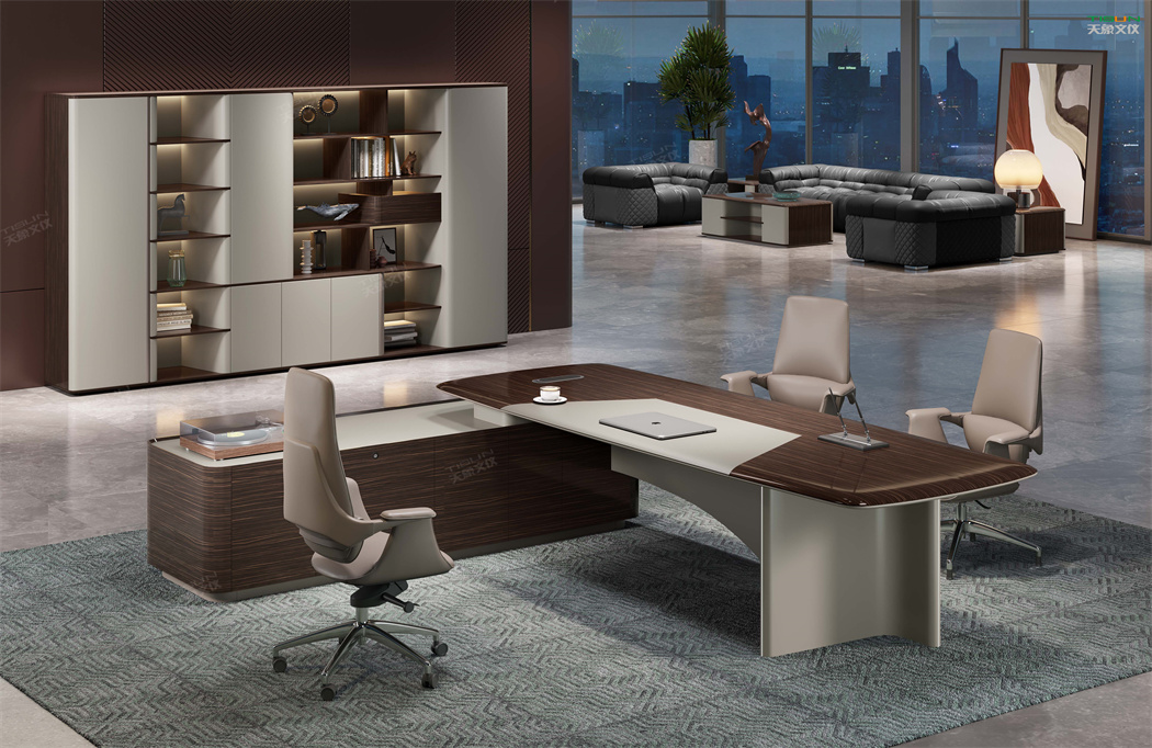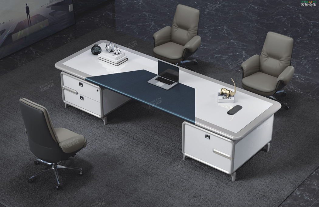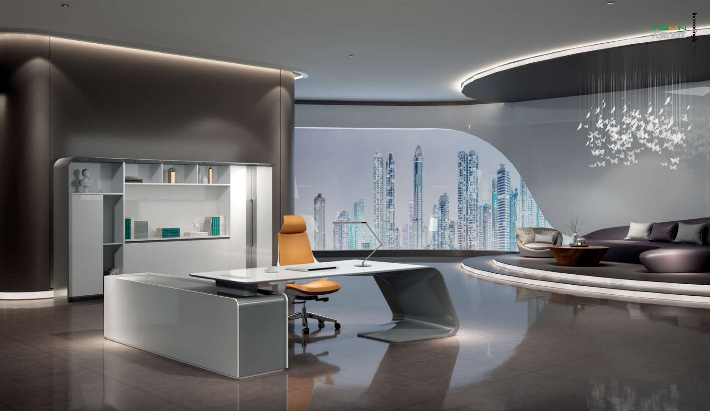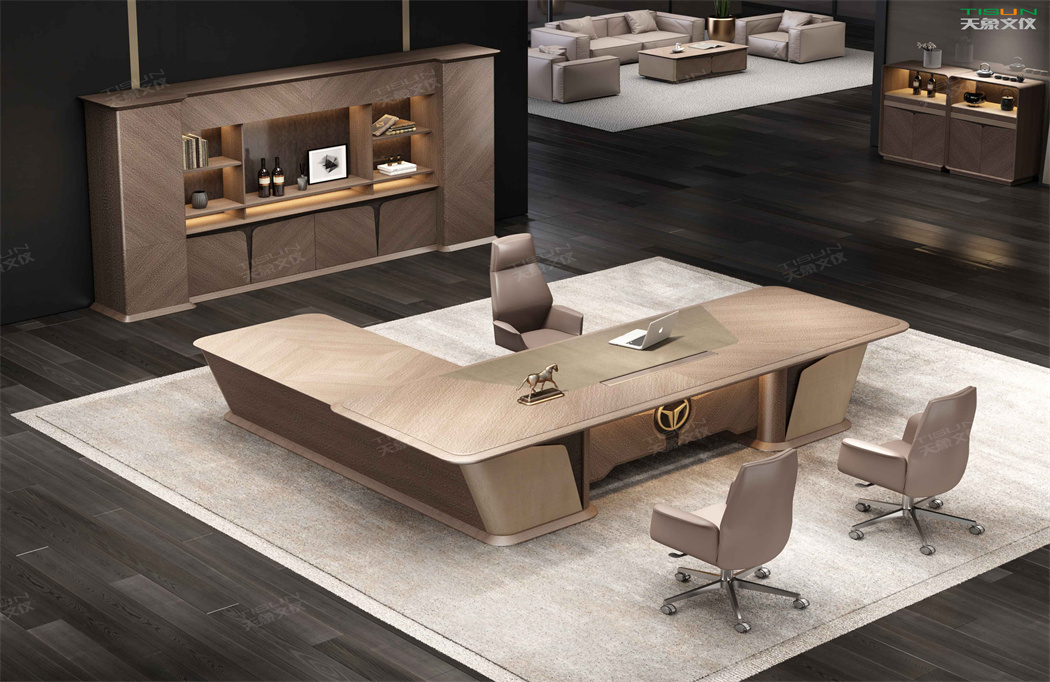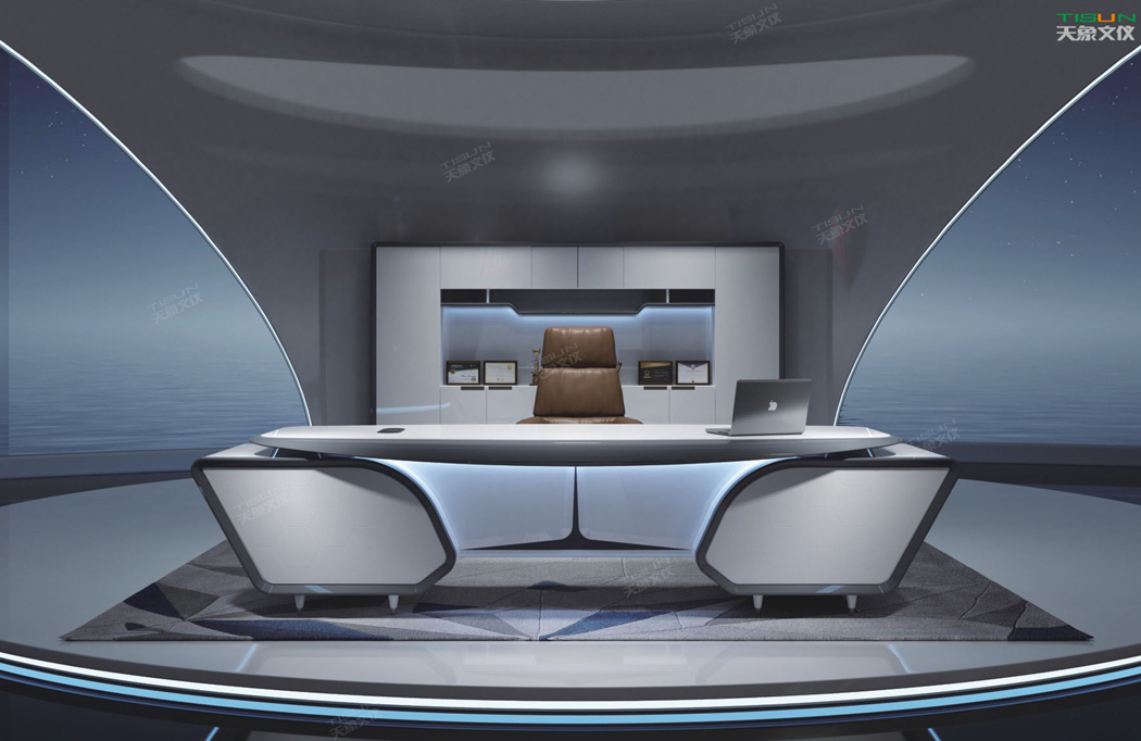 此款定制辦公家具大班臺打破傳統的做法,開闊創新,萃取傳統中式風格與現代風格之精華的相結合,打造出此款尊貴大氣的辦公桌,同時也為現代辦公環境注入了一股新的源泉。班臺大面積采用灰色超纖皮,提升辦公舒適度。細節提升品質,側邊柜增設開放存儲空間,邊柜內側CPU存放和收納功能并存,集收納與展示于一體,更能突顯主人具備現代的氣息。