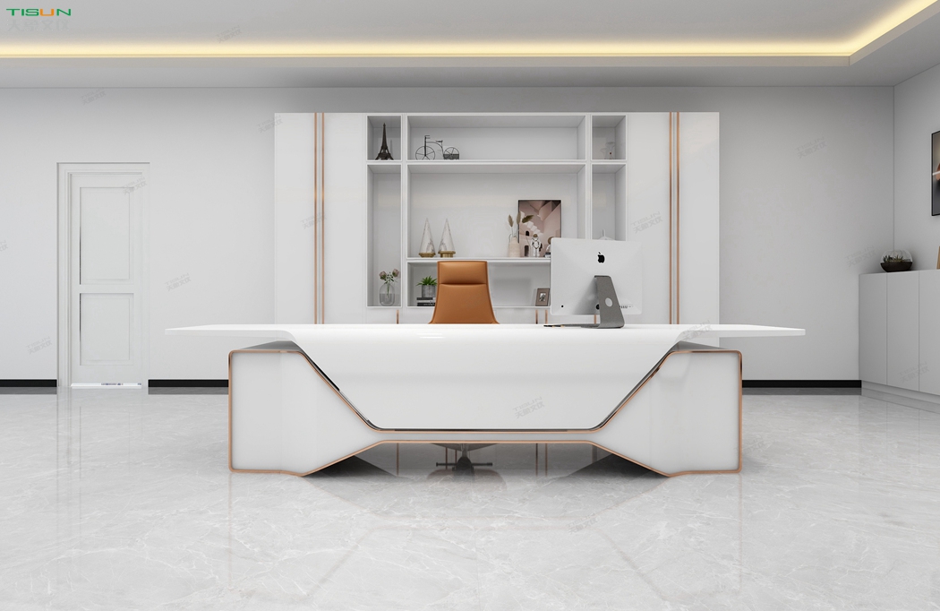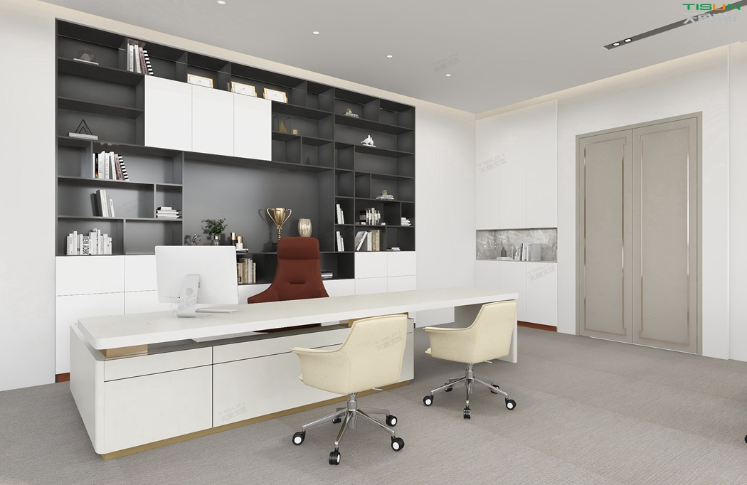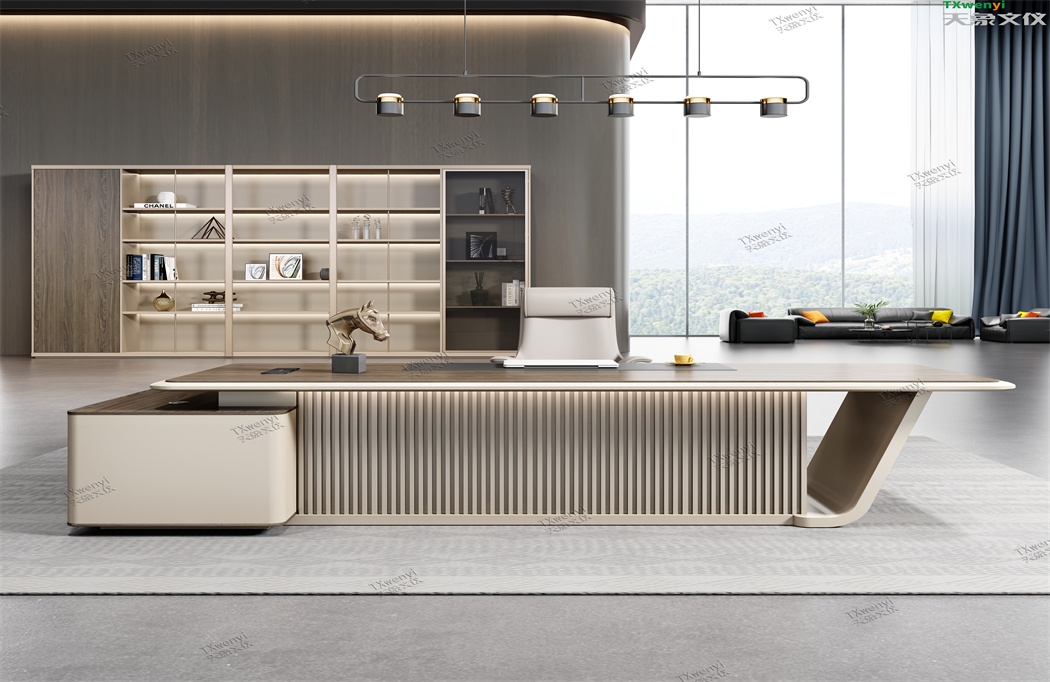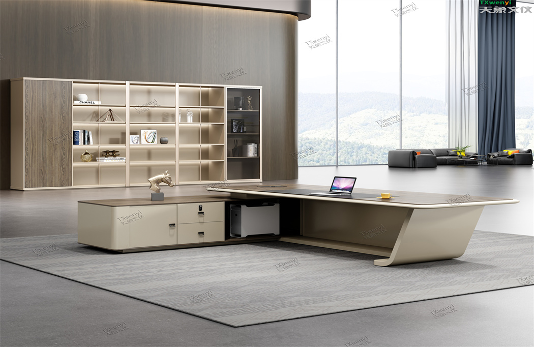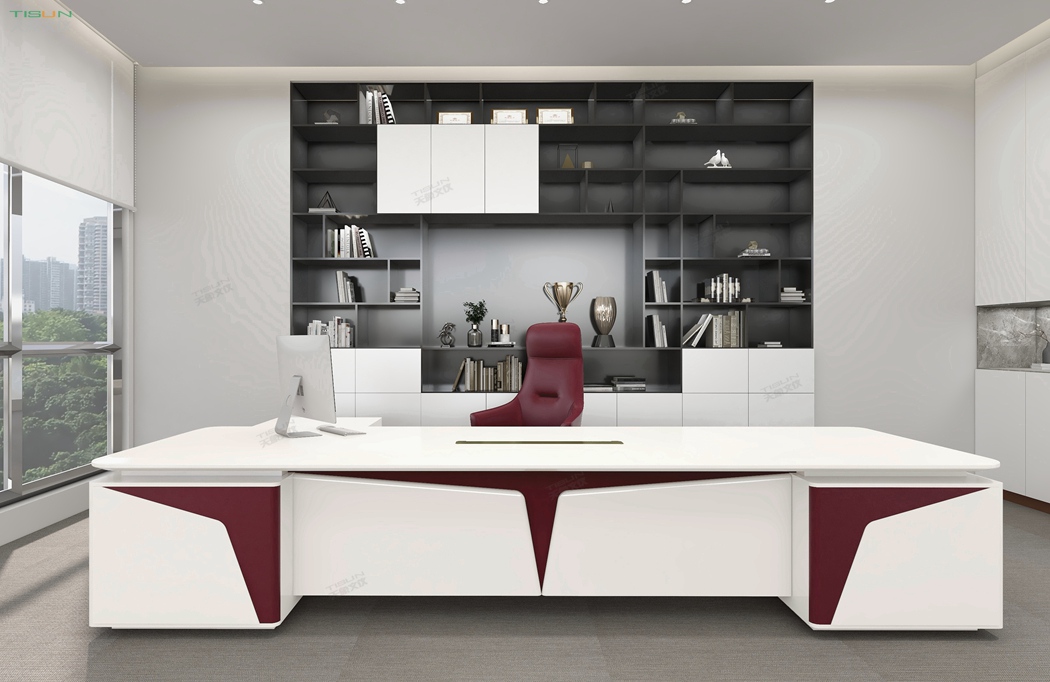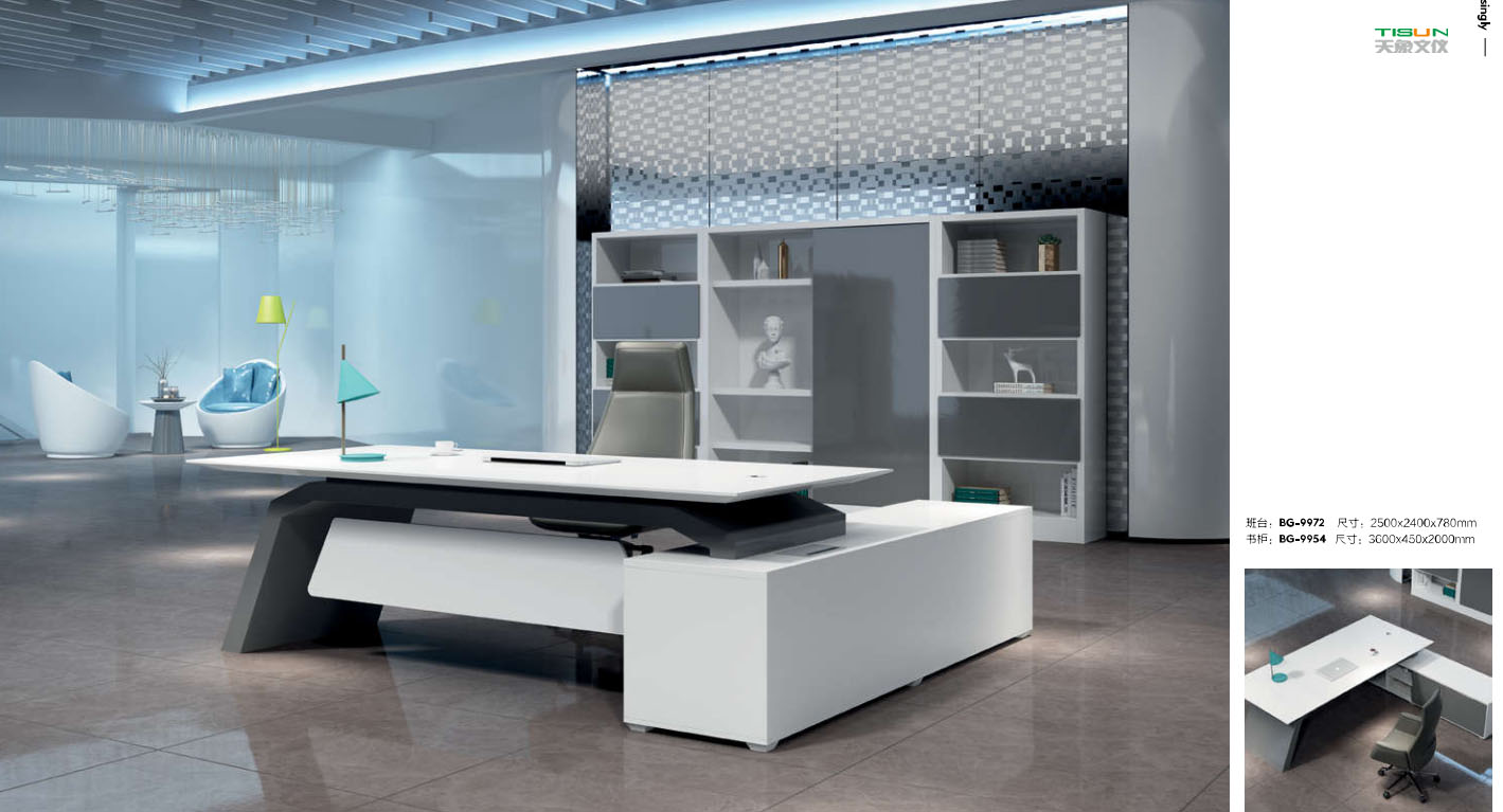 此款定制辦公家具大班臺打破傳統的做法,開闊創新,萃取傳統中式風格與現代風格之精華的相結合,打造出此款尊貴大氣的辦公桌,同時也為現代辦公環境注入了一股新的源泉。班臺大面積采用灰色超纖皮,提升辦公舒適度。細節提升品質,側邊柜增設開放存儲空間,邊柜內側CPU存放和收納功能并存,集收納與展示于一體,更能突顯主人具備現代的氣息。