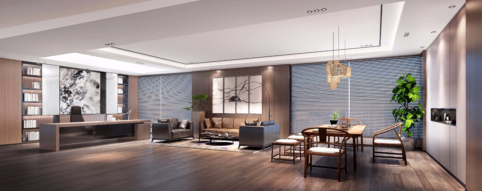 老總辦公室彰顯一個企業領導的風格和品位, 還能體現一個公司的形象, 表達一個企業的文化價值。在功能上:作為工作和休息兼得空間,應該具備穩重、大氣舒適安靜的特點,老總辦公室裝修需要貼合主人的年齡、性格、興趣愛好來選擇設計風格是沉穩寧靜還是現代時尚。