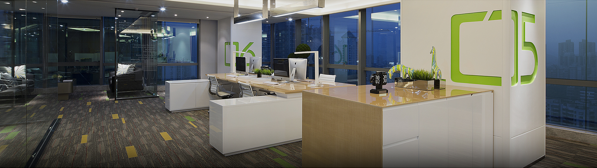 辦公區(qū)的陳設(shè)主要遵循使用方便的原則,辦公的家具用品的位置首先要考慮工作位的使用效率,其次則是協(xié)調(diào)統(tǒng)一的原則,家具的材料色彩與裝飾立面、地面材料顏色協(xié)調(diào)統(tǒng)一。
